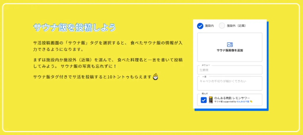 これまで意外にも集約されてこなかった「サウナの後に、どこで何を食べればいいか?」という情報をサウナーの方々に共有してもらうべく、サウナに入った後に食べる「サウナ飯」投稿機能を「サウナイキタイ」内に新たに追加し、2021年の機能追加後に1年間で約16万件以上もの“サウナ飯”が投稿され盛り上がりを見せている。