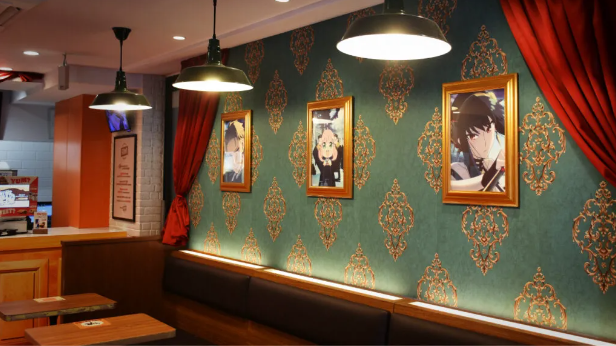 「バーガーキング® バーリント店」の店内は、「SPY×FAMILY」の舞台・オスタニアの首都 バーリントの世界観を表現した空間に仕上げられ、人気のキャラクターやアニメの名シーンが描かれたパネルも展示された。
