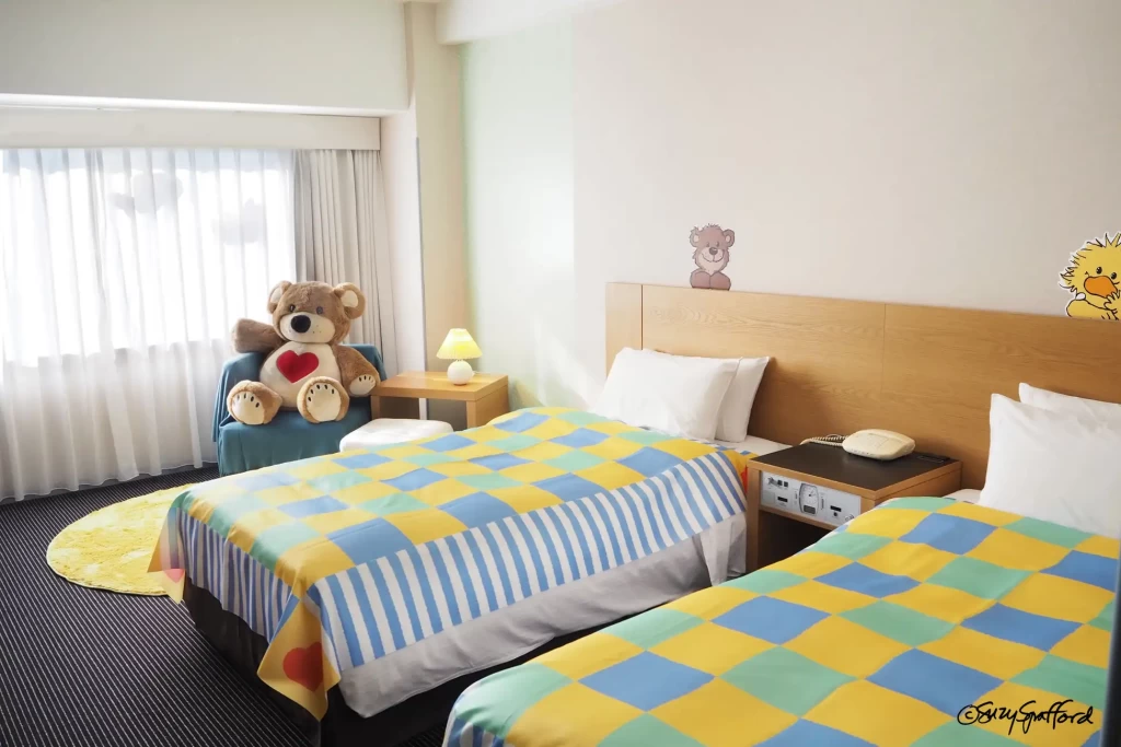 お部屋に入るとまず大きなブーフがお出迎え!ベッドシーツも「Suzy’s Zoo(スージー・ズー)」の世界ならではの、やさしい色味を採用。