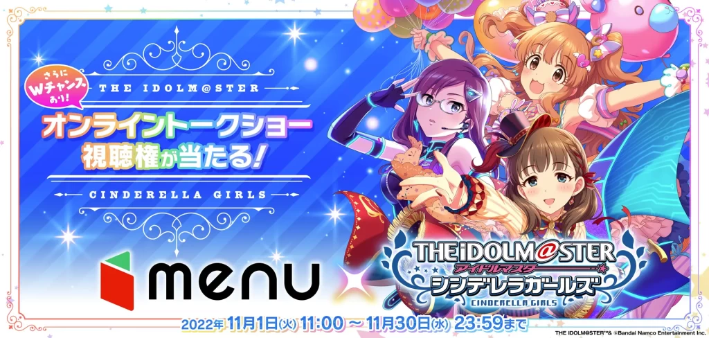 この度menuでは、「アイドルマスター シンデレラガールズ」の「THE IDOLM@STER CINDERELLA GIRLS Twinkle LIVE Constellation Gradation」の開催を記念して、コラボキャンペーンを2022年11月1日(火)~2022年11月30日(水)の期間で開催。本キャンペーンにご参加いただいた方の中から抽選で、オンライン配信イベントの視聴権と、menu描き起こしオリジナルミニキャラクターデザインのポストカードをプレゼント。その他、声優キャストサイン入りグッズが当たる他、応募者全員にmenuオリジナルの待ち受け画面をプレゼントする。