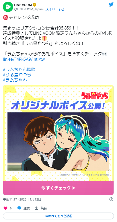 そして、キャンペーン最終日である1月12日には、達成条件の3倍以上となる合計35,859件のリアクションが集まったことが発表され、達成特典としてLINE VOOM限定の「ラムちゃんからのお礼ボイス」が投稿。