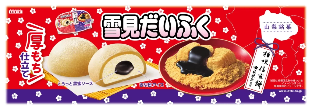 桔梗屋が製造・販売する山梨銘菓「桔梗信玄餅」とコラボレーションした「雪見だいふく」だ。