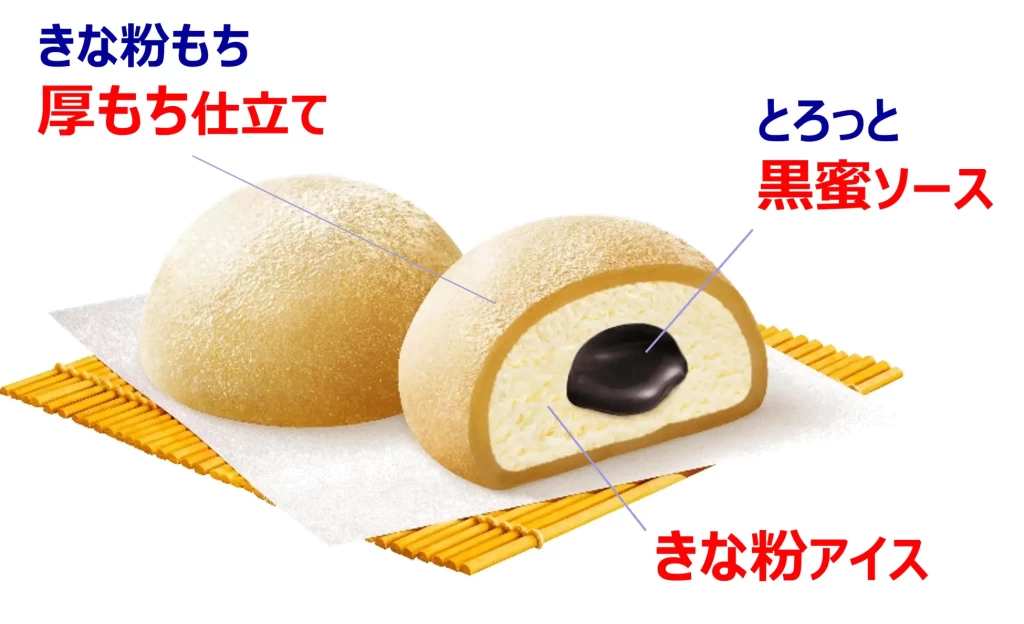 「桔梗信玄餅」の味わいをイメージし、とろっとした黒蜜ソースを、きな粉アイスと冷凍下でもやわらかい“厚もち”仕立てのきな粉もちで包んだ特別な「雪見だいふく」に仕上げた。