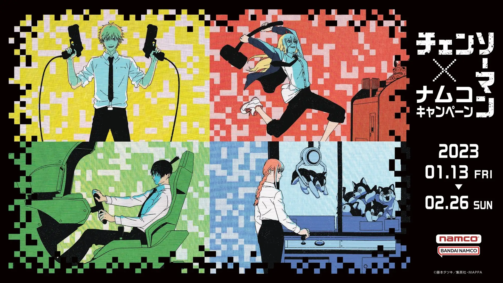 株式会社バンダイナムコアミューズメントは、アニメ『チェンソーマン』とのコラボ企画、『チェンソーマン×ナムコキャンペーン』を、2023年1月13日(金)から2月26日(日)まで、全国の直営アミューズメント施設「namco」とネットクレーンモール「とるモ」で開催する。