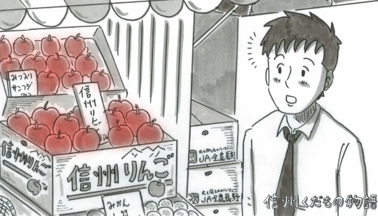 そんな男性が、落ち込みながら道を歩いていたとき、ふと八百屋の前を通ると、信州りんごが売られているのを見つける。そのりんごを見ているうちに、ある昔の記憶が鮮明に蘇る。
