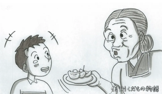 祖母は、思いっきりタコのような変顔をしながら、切ったりんごを差し出す。そのあまりに面白い変顔に、男の子は思わず大笑いする。