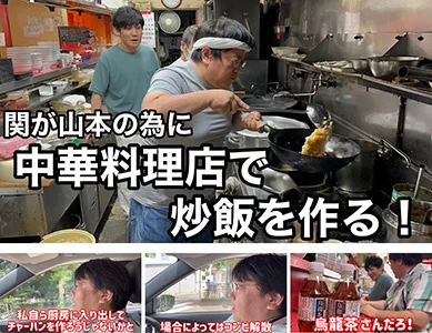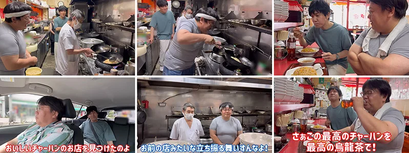 はじめて持つ中華鍋に、緊張気味の関さん。相方の山本さんも不安そうな表情。中華料理店の師匠から指導を受け、いざ鍋振りに挑戦。タオルを頭に巻いた関さんの風貌は、ガチ中華クリエイターそのもの。学んだことを実践し、テキパキと作業をこなしていきます。そしていよいよ実食。気になるお味は、、、まさかの薄味。そこで、ご主人から一言。「醤油じゃなくて、ごま油入れてたからね。」遅すぎる指摘に、現場は大盛り上がり。最後は「サントリー烏龍茶」で締めの乾杯。師匠の人柄もあり、終始アットホームな雰囲気での撮影でした。