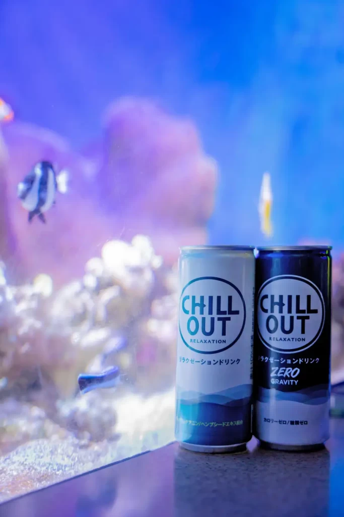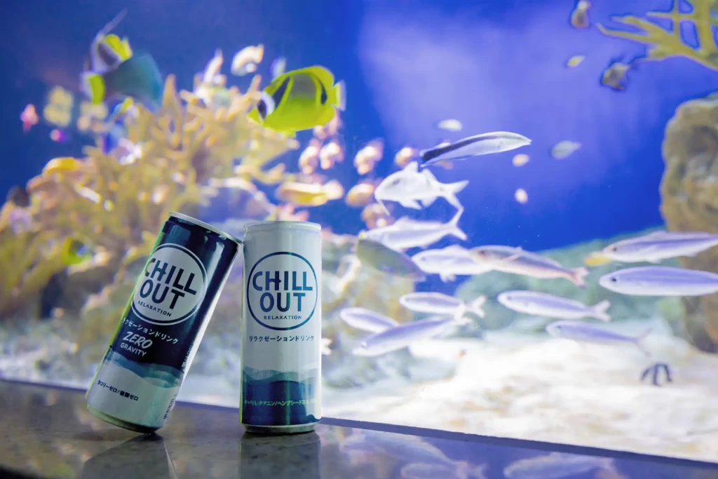 会期中は、来場される皆様にリラクゼーションドリンク「CHILL OUT」をプレゼントいたします。CHILL OUTを手に取り、館内をお楽しみください。また、心地よいひとときを味わっていただくために、新江ノ島水族館の見どころである100種類2万匹の魚たちが生息する相模湾大水槽の前には、靴を脱いで寝転がることができるカーペットとクッションをご用意しています。自宅のリビングのようなくつろぎの中で、海の生き物たちを眺めることができます。