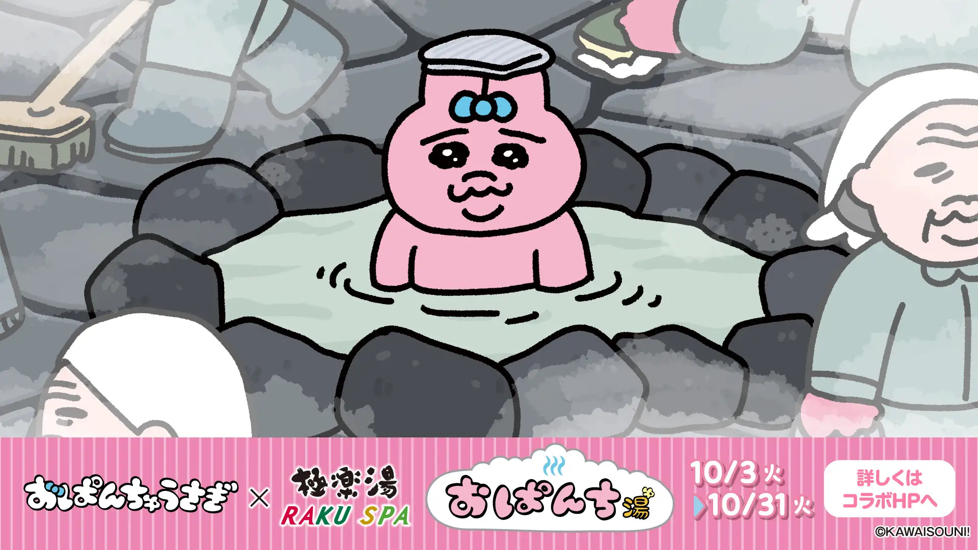 株式会社極楽湯は中外鉱業株式会社と共同主催で、2023年10月3日(火)より極楽湯RAKU SPAグループ13店舗で、「おぱんちゅうさぎ」とのコラボキャンペーン“おぱんち湯(おぱんちゅ)”を開催する。