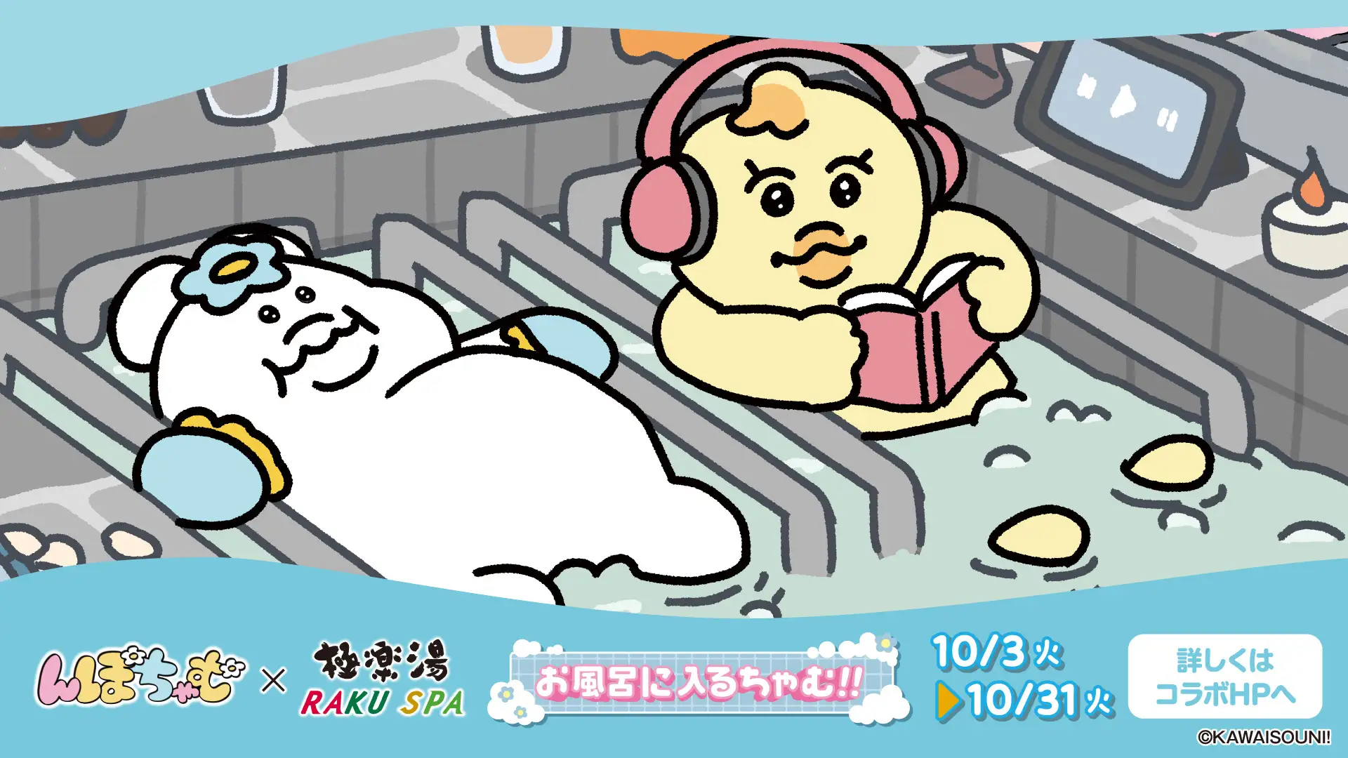 株式会社極楽湯は中外鉱業株式会社と共同主催で、2023年10月3日(火)より極楽湯RAKU SPAグループ9店舗で、「んぽちゃむ」とのコラボキャンペーン“お風呂に入るちゃむ!!”を開催する。