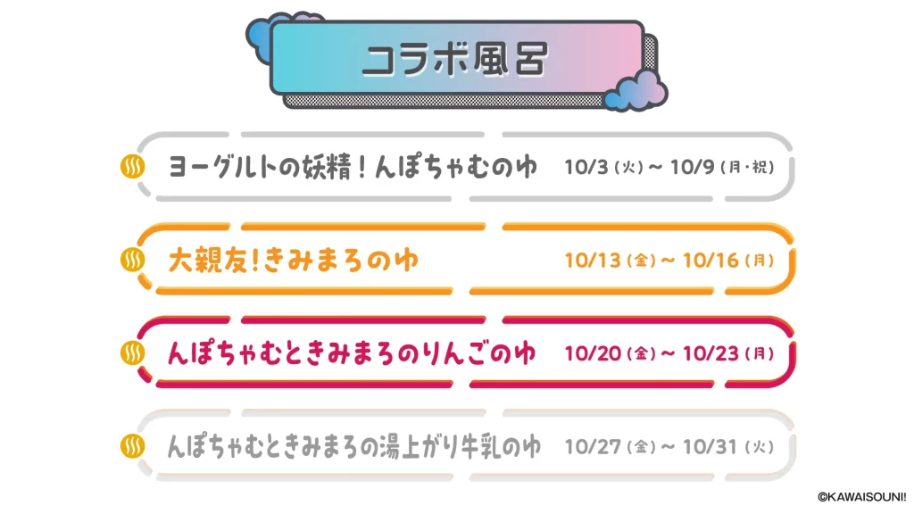 んぽちゃむをイメージした4種類のコラボ風呂が登場し、浴室には特別にデザインしたタペストリーを装飾します。