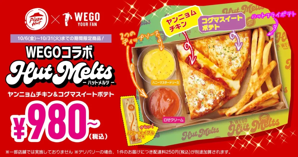 ピザハットはWEGOとのコラボ商品発売を記念して、10月7日(土)・8日(日)の計2日間、WEGO 1.3.5… 原宿竹下通り店前にてポップアップショップをオープンします。会場では、【WEGOコラボ Hut Melts(ヤンニョムチキン&コグマスイートポテト)】をお持ち帰り限定/数量限定にて、500円(税込)というスペシャルな価格で販売します。