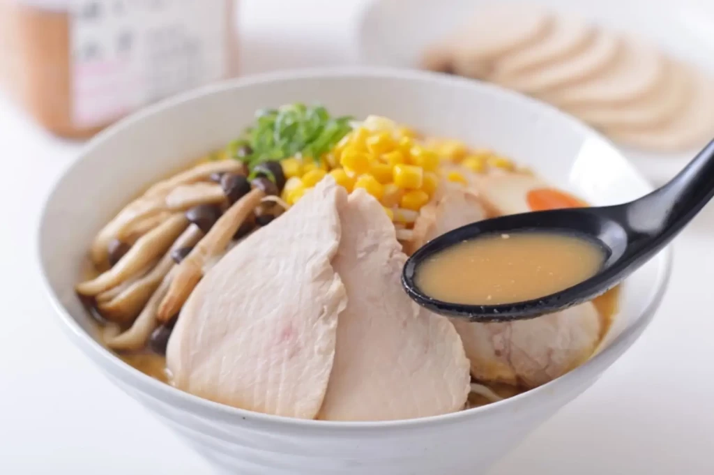 トッピングの具材となる、鶏むねチャーシューには、塩こうじを液体化した「液体塩こうじ」を使用することで、うま味が増し、分厚いチャーシューがやわらかく仕上がっています。さらに、スープには、塩こうじを粉末化した「熟成こうじパウダー」を加えることで、深い味わいを実現しました。