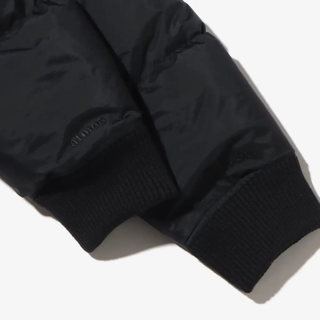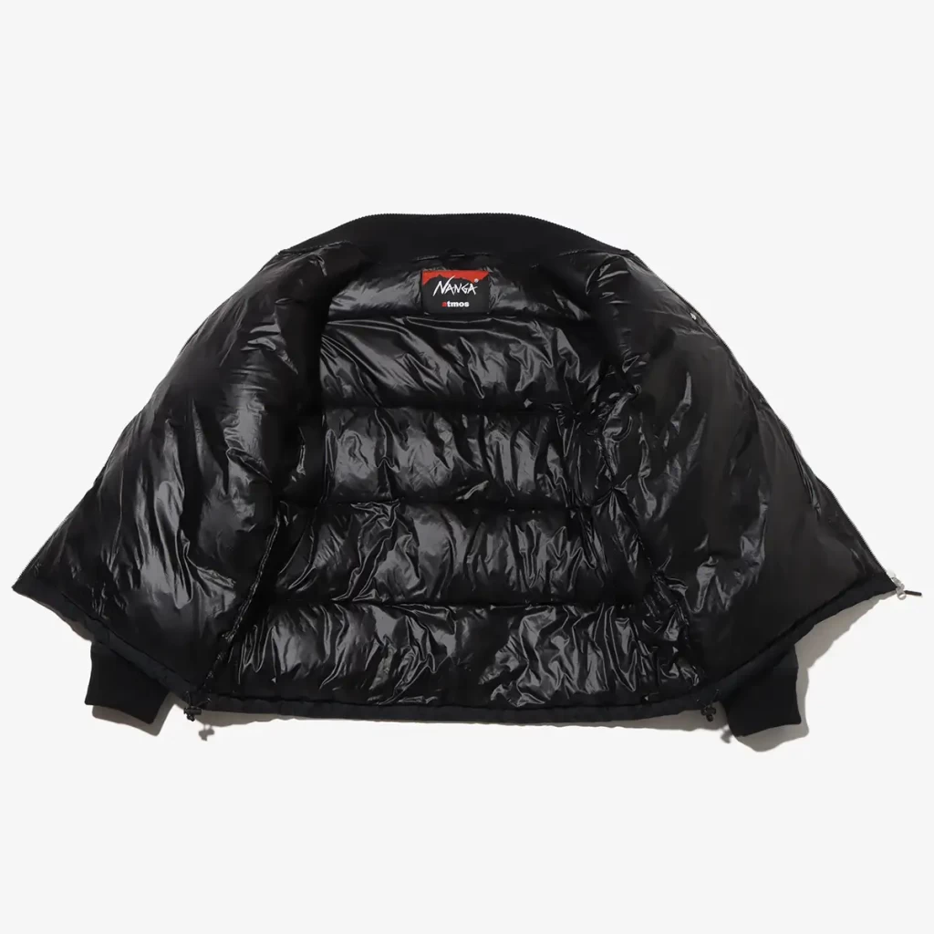 左右の袖には、コラボの証左として「ナンガ」と「アトモス」のロゴをボディと同色の刺繍でデザイン。