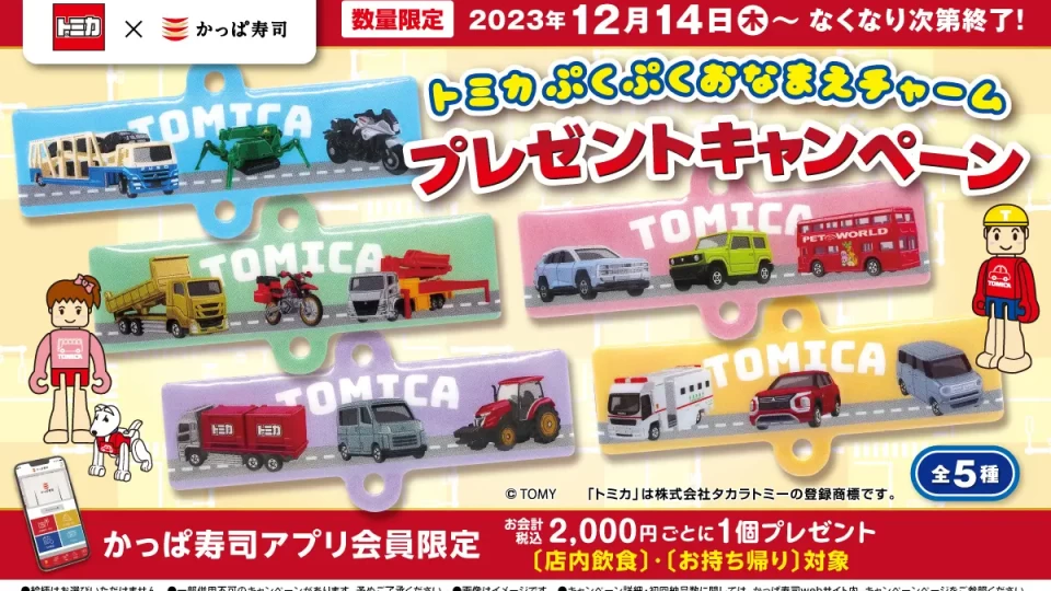 企業コラボ 2023.12.28企業コラボ 【『トミカ』×かっぱ寿司】「ぷくぷくおなまえチャーム」プレゼントキャンペーン開催!【12月14... コロワイドグループのかっぱ寿司は、親子3世代にわたり愛されるミニカーブランド『トミカ』とコラボレーションし、2023年... 2023.12.28企業コラボ
