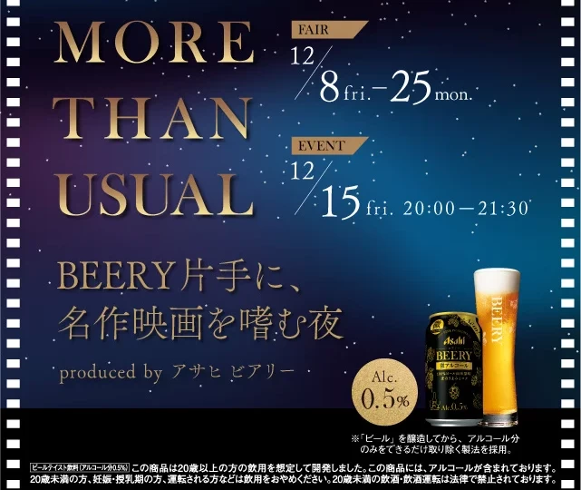 企業コラボ 2023.12.28企業コラボ 【アサヒ×Filmarks】『MORE THAN USUAL – BEERY片手に、名作映画を嗜む夜-』を六本木 蔦... 日本最大級の映画・ドラマ・アニメレビューサービスを運営するFilmarksは、このたび、アサヒビール主催、六本木 蔦屋... 2023.12.28企業コラボ