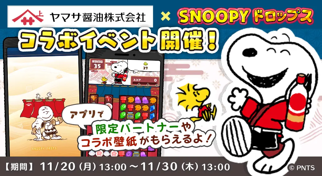 爽快パズルゲーム『スヌーピードロップス』にて、「ヤマサ醤油」との、スペシャルコラボイベントを開催する。