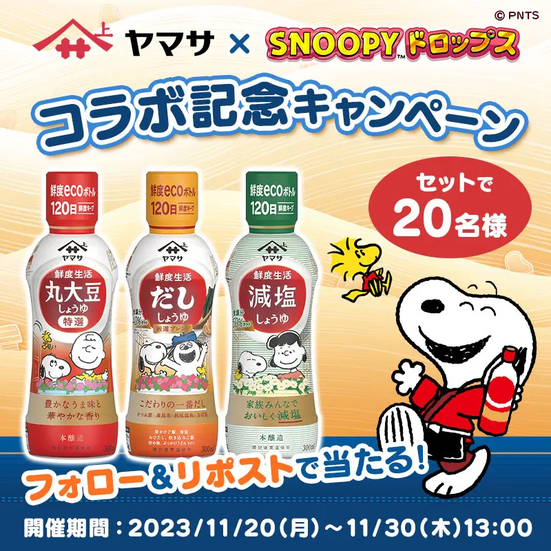 公式X(旧Twitter)、『スヌーピードロップス』と『ヤマサ醤油 公式』の、両方のアカウントをフォローして、11月20日に投稿されるキャンペーン投稿をリポストした方の中から抽選で20名様にプレゼントが当たります!