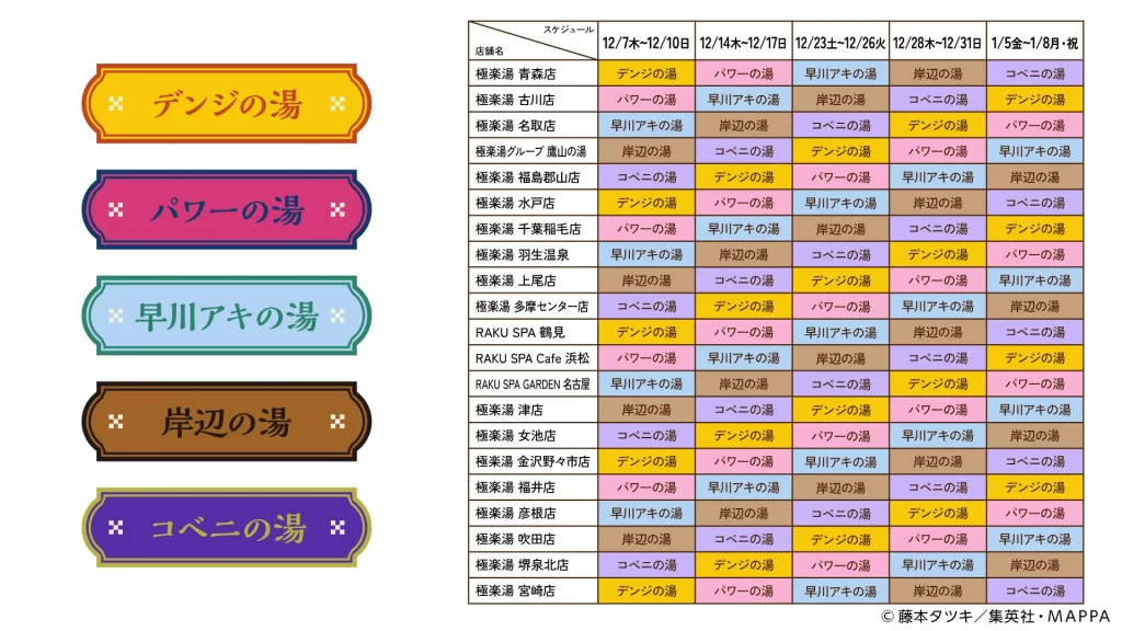 キャラクターをイメージした5種類のコラボ風呂が登場し、浴室には特別にデザインしたタペストリーを装飾します。各店舗の開催スケジュールはコラボHPをご確認ください。