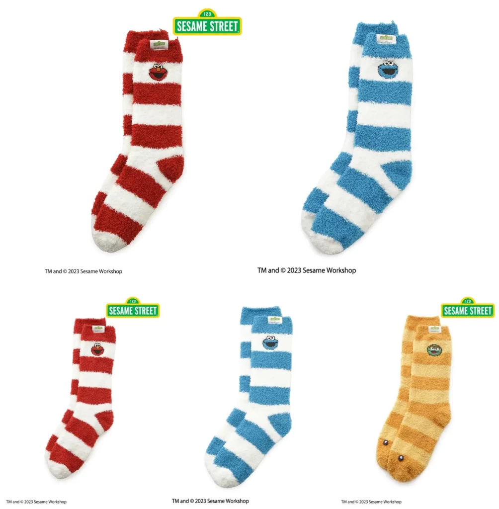 エルモとクッキーモンスターの顔をそれぞれアップリケで添えたボーダーソックスです。