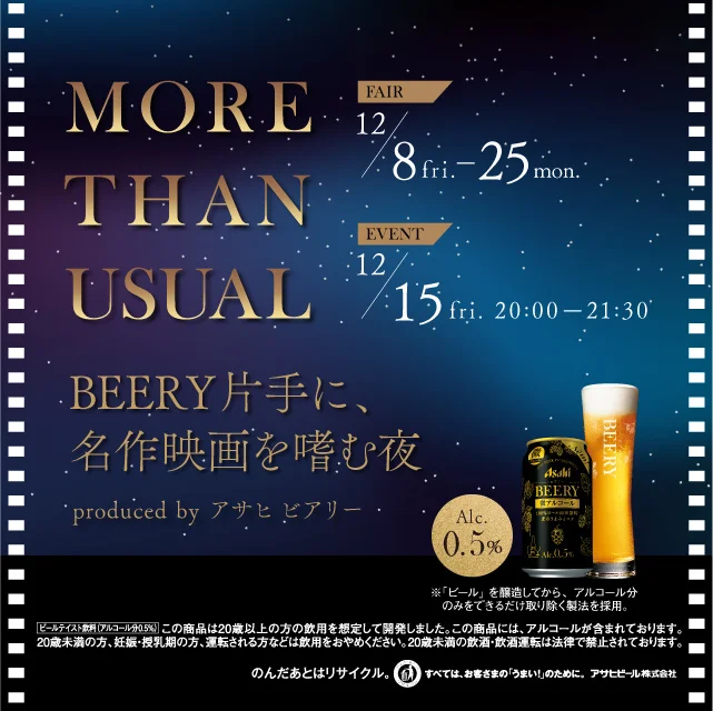 【アサヒ×Filmarks】『MORE THAN USUAL – BEERY片手に、名作映画を嗜む夜-』を六本木 蔦屋書店で開催【12月15日】