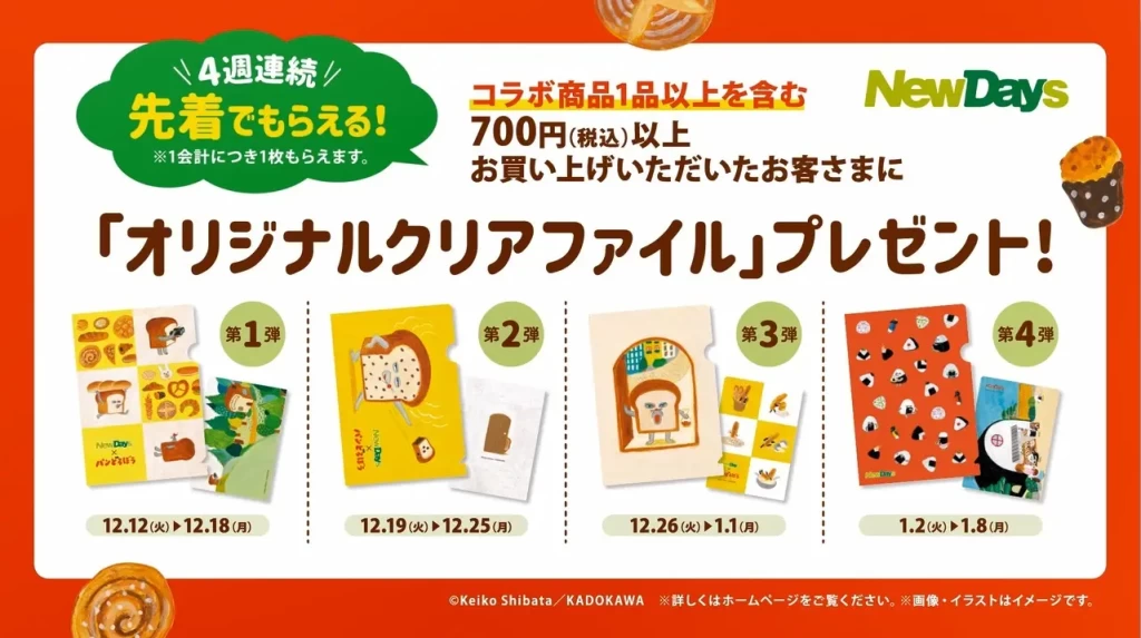 コラボ商品1品以上を含む700円(税込)以上ご購入のお客さまに、このキャンペーンでしか手に入らない「オリジナルクリアファイル」をレジにて先着でプレゼントいたします(数量限定・各店舗なくなり次第終了、1会計につき1枚のみ)。週替わりでクリアファイルのデザインが変わります。
