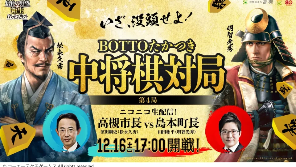 ゲーム 2024.01.04ゲーム 【高槻市長×島本町長】中将棋対局が人気ゲーム「信長の野望」とコラボ!【12月8日】 恒例の人気企画となっている「【高槻市長VS島本町長】BOTTOたかつき中将棋対局」。第4局となる今回は人気ゲーム『信長... 2024.01.04ゲーム
