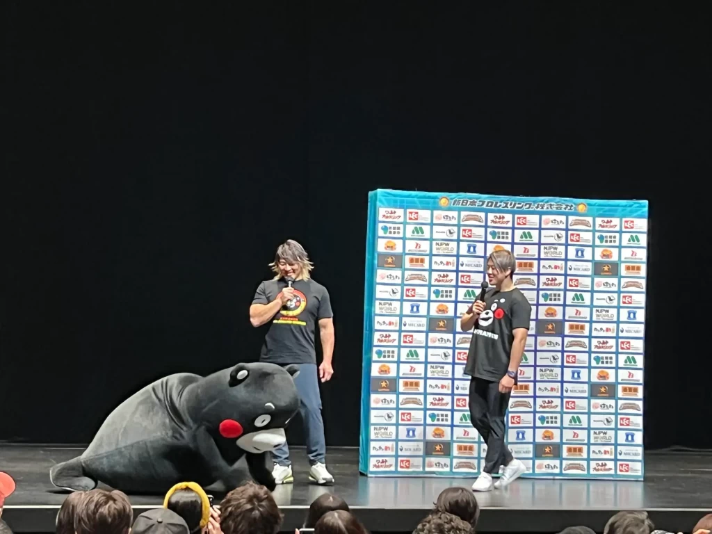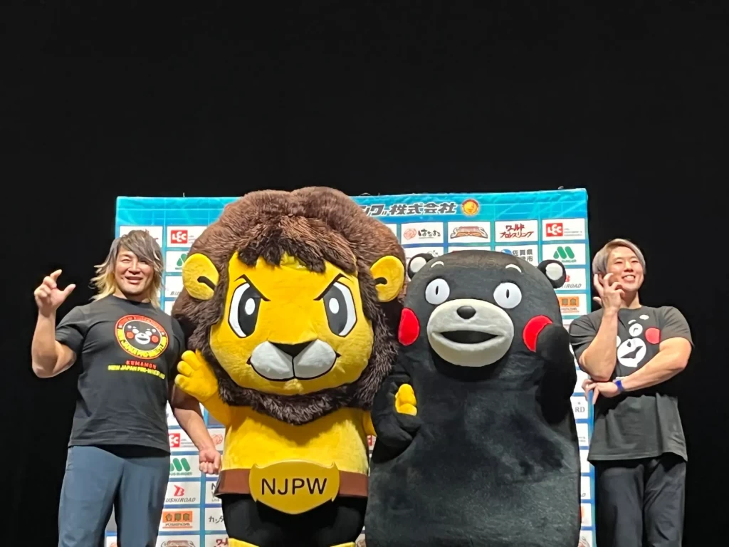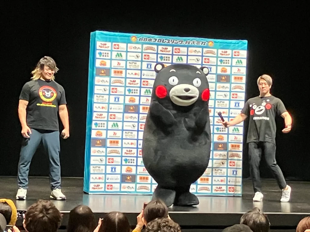 その後、新日本プロレスのマスコットキャラクター・ジッピーくんも登場し、4人での記念撮影後、「これからも熊本の応援をよろしくま。そして、明日の試合、頑張ってほしいモン!」と伝え、くまモンは惜しまれつつ退場した。