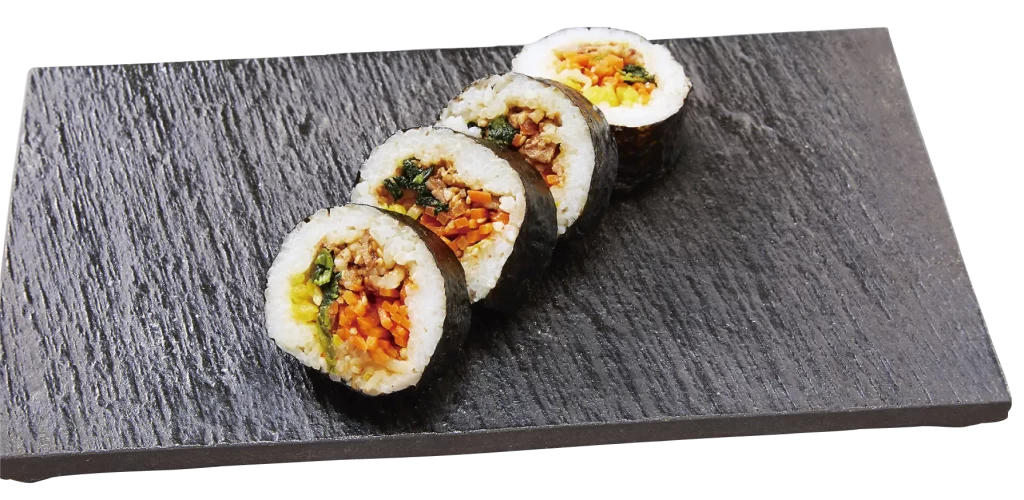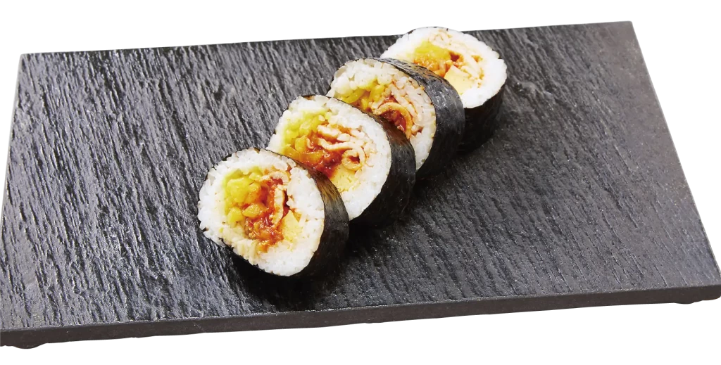 辛みの3カウント!牛焼肉の入ったキンパ太巻きを一口食べると闘魂ビンタを食らったかのような美味しさの衝撃が止まらない。
