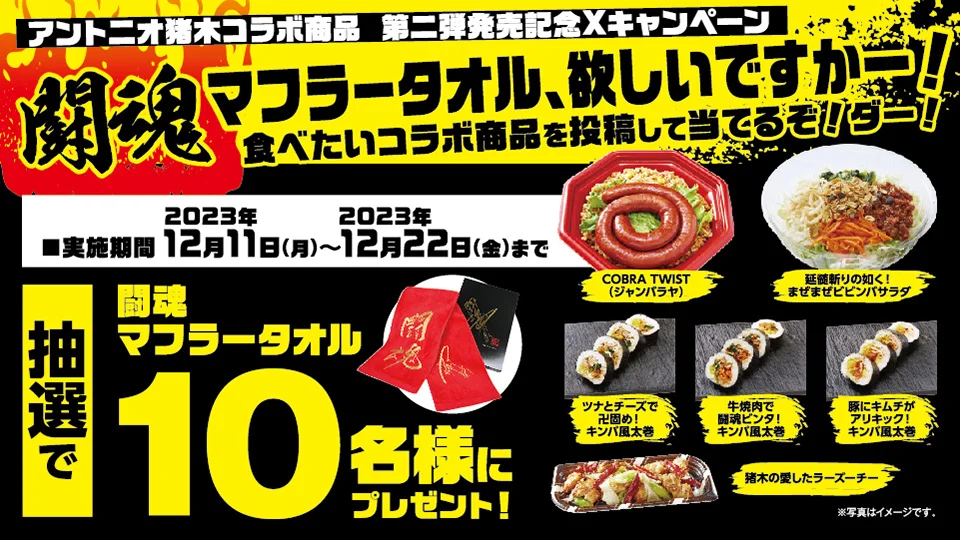 ベルクオリジナル商品第2弾の発売を記念して2023年12月11日(月)~2023年12月22日(金)までの期間中、ベルク公式X(@belc_jp)のアカウントをフォローして指定のポストに #アントニオ猪木コラボ のハッシュタグをつけて引用RP(リポスト)していただいた方の中から抽選で10名様に「闘魂マフラータオル」をプレゼントするキャンペーンを開催いたします。