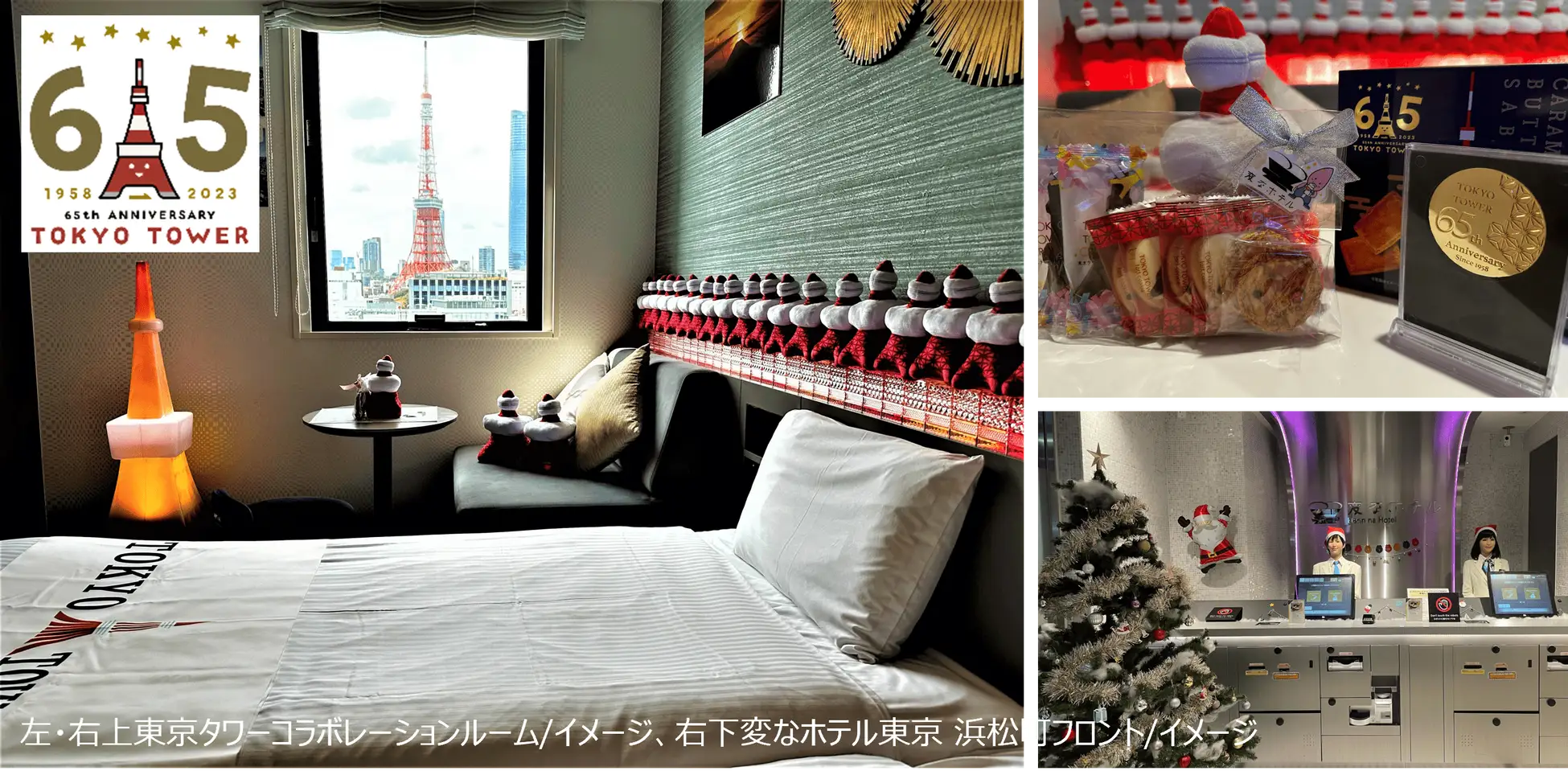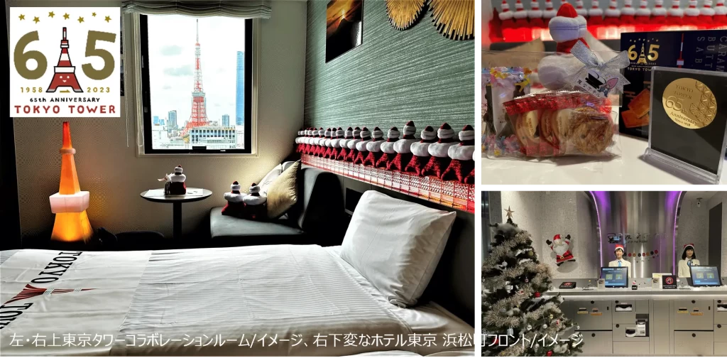変なホテル東京 浜松町は、株式会社TOKYO TOWERとコラボレーションし、開業65周年を記念した「東京タワーコラボレーションルーム特別プラン」を発売します。コラボレーションルームは沢山の東京タワーグッズを飾り、窓から東京タワーがのぞめる客室で、東京タワーメインデッキの入場券付きです。今回特別プランとして、2023年12月22日(金)~24日(日)・12月26日(火)~2024年3月31日(日)の期間限定で、開業65周年を記念して作られた「東京タワーキャラメルバターサブレ」と「65周年記念メダル」をプレゼントします。さらに、12月22日(金)~24日(日)は、クリスマスケーキとスパークリングワインをご用意し、客室をクリスマスカラーに装飾します。価格は、素泊まり 32,200 円~、朝食付34,800 円~(いずれも1泊1 部屋、税サ込)。変なホテル東京 浜松町は、フロントでは人型ロボットがお客様をお出迎えし、最短10秒でチェックインが完了するエクスプレスチェックインを導入しています。東京駅・品川駅・羽田空港へのアクセスがよく、JR 浜松町駅へ徒歩約3分、都営大江戸線・浅草線の2路線の大門駅へ徒歩約1分と、ビジネス・レジャーどちらの拠点にも大変便利です。ホテル公式ホームページ:https://www.hennnahotel.com/hamamatsucho/