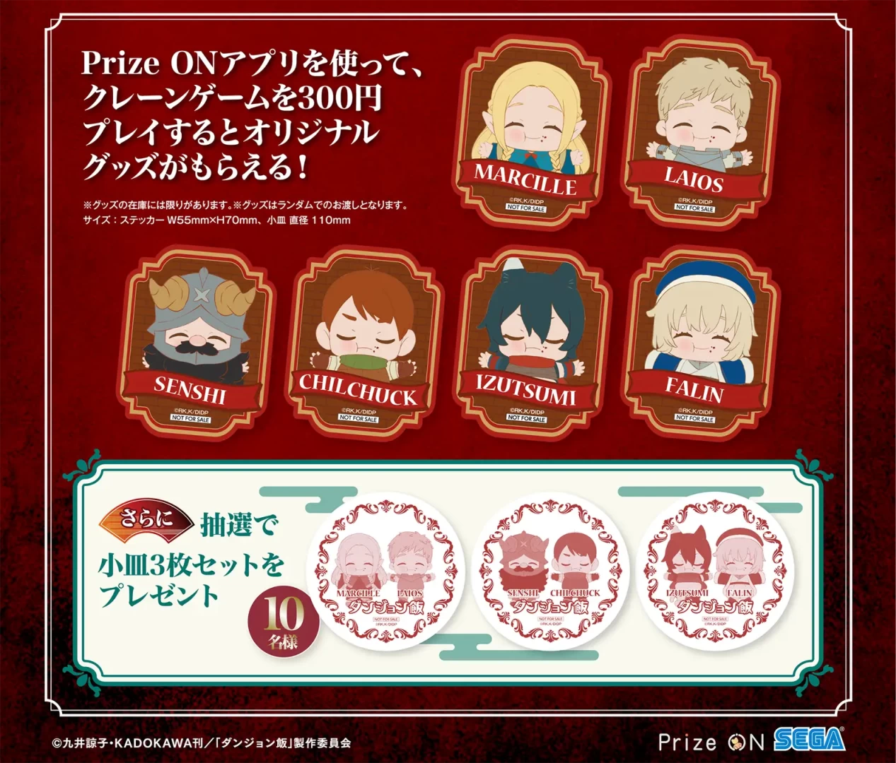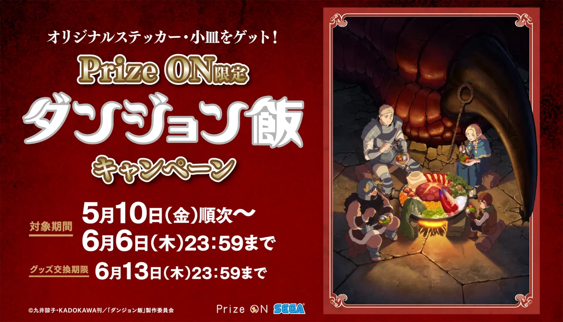株式会社セガ フェイブは、UFOキャッチャー®をおトクに遊べるアプリ『Prize ON(プライズ オン)』で、『Prize ON限定「ダンジョン飯」キャンペーン』を2024年5月10日(金)より開催しています。