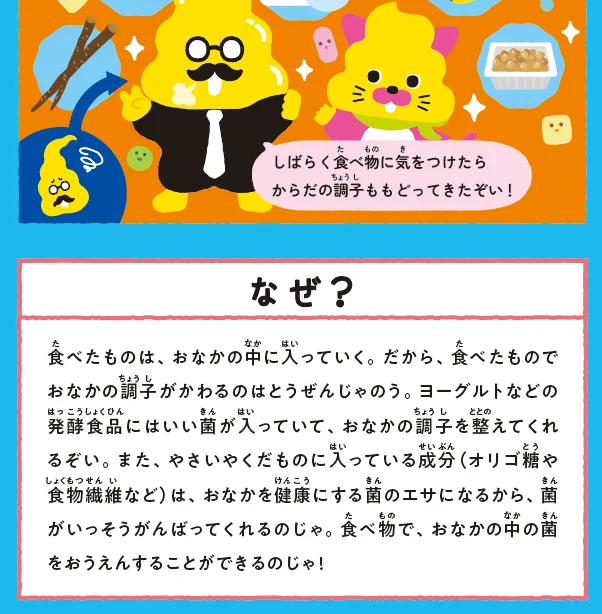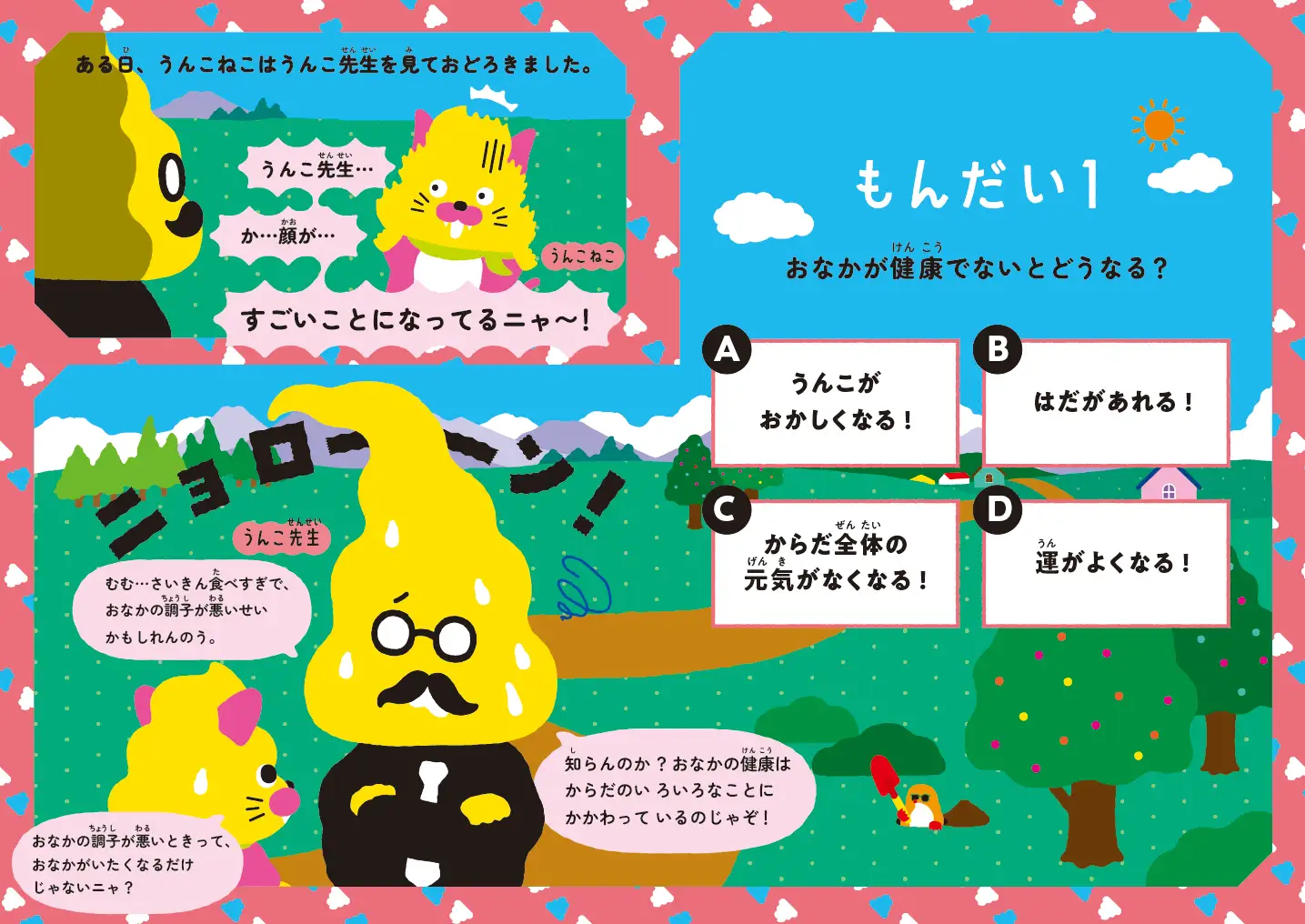 冊子では、最近食べ過ぎでおなかの調子がよくない、うんこドリルシリーズでおなじみのキャラクター・うんこ先生が、うんこねこにおなかの健康はからだのいろんなことに関わっていることを教える場面からはじまります。