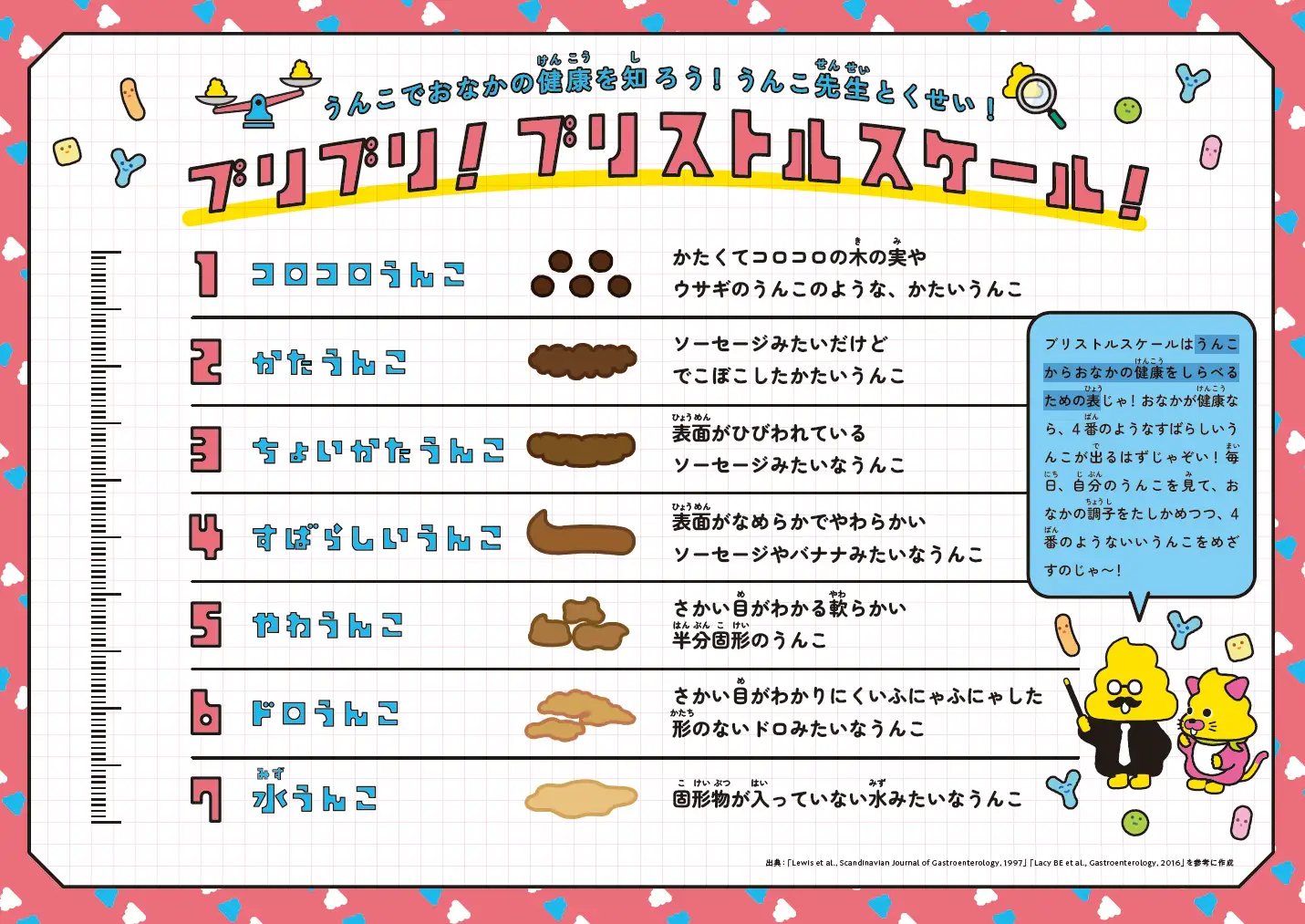 巻末には、うんこの状態からおなかの健康を調べるための表「ブリストルスケール」というコンテンツが。うんここそおなかの健康のバロメーター。うんこにもいろんな状態のうんこがありますが、おなかの健康をつくりすばらしいうんこが出せるように、ワクワク楽しみながら実践的に考えられるようになっています。