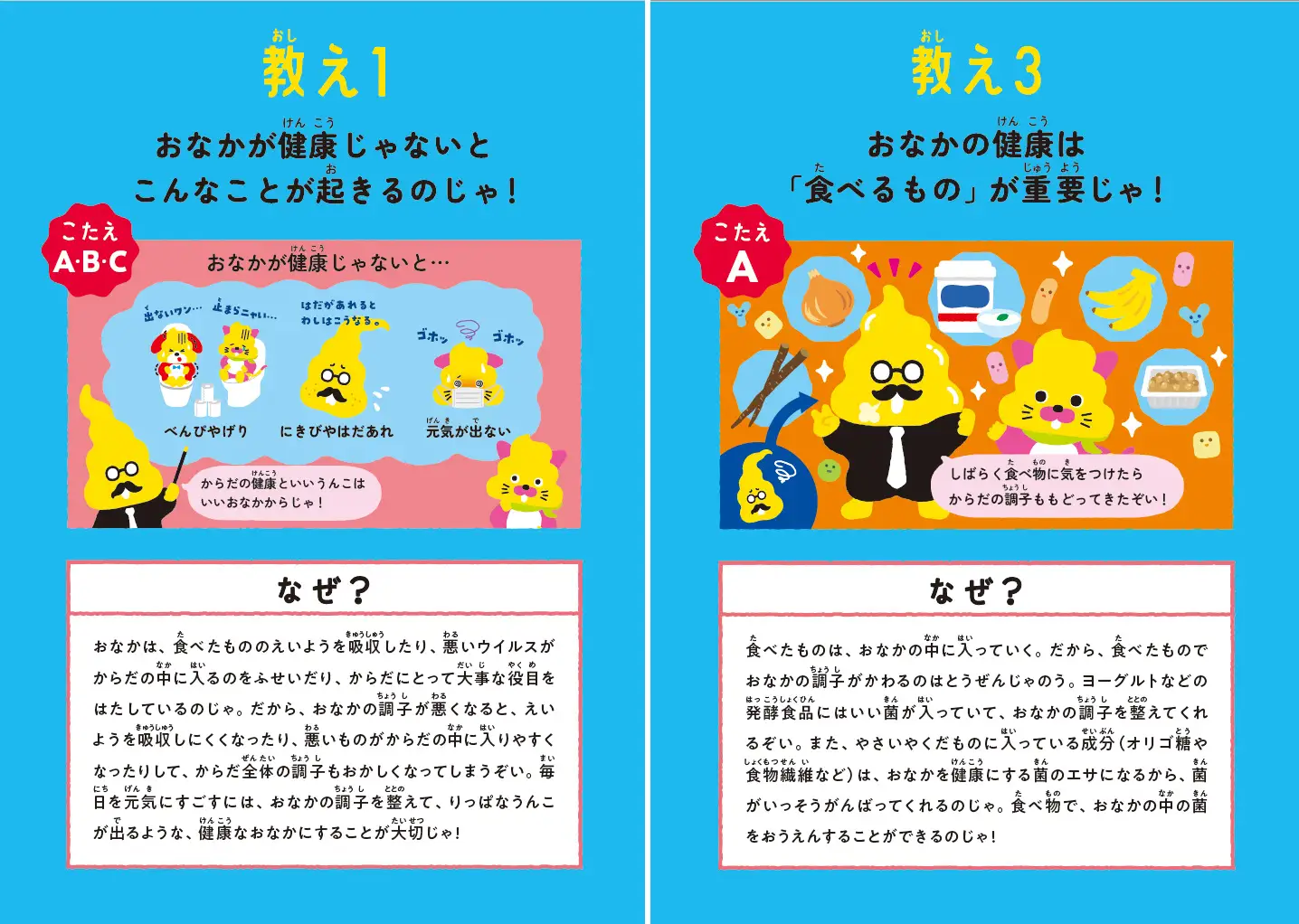 クイズをつうじて、毎日を元気に過ごすためにおなかの調子を整えることの大切さや、おなかの中にいるビフィズス菌や乳酸菌はからだの健康を助けるいい菌であること、おなかの健康には食べるものが重要であることといった、おなかの健康に関するさまざまな知恵を学ぶことができます。