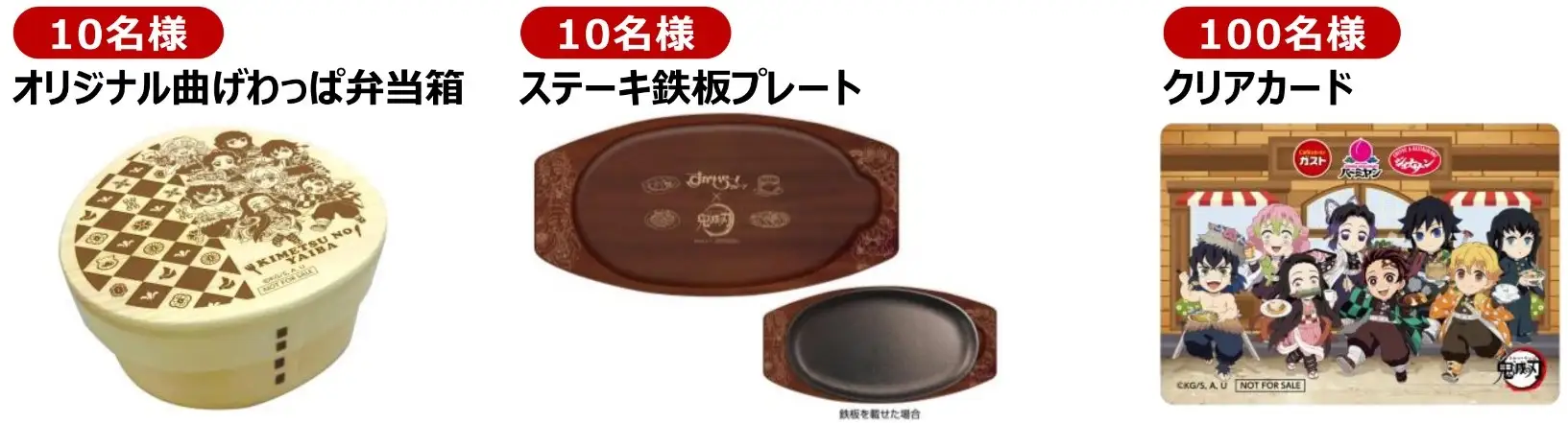 | \「鬼滅の刃」コラボキャンペーン おすすめポイント / ① ガスト・バーミヤン・ジョナサンに、異なるそれぞれのキャラクターコラボメニュー登場 ② 対象メニューを食べて、限定・描き下ろし柄のオリジナルクリアファイルをゲット! ③ お子様メニュー「ラッキーセット」についてくるカプセルトイが“鬼滅の刃”グッズに ※「鬼滅の刃」のカプセルトイは、ガスト/バーミヤン/ジョナサン/しゃぶ葉/夢庵/ステーキガストで実施中です |