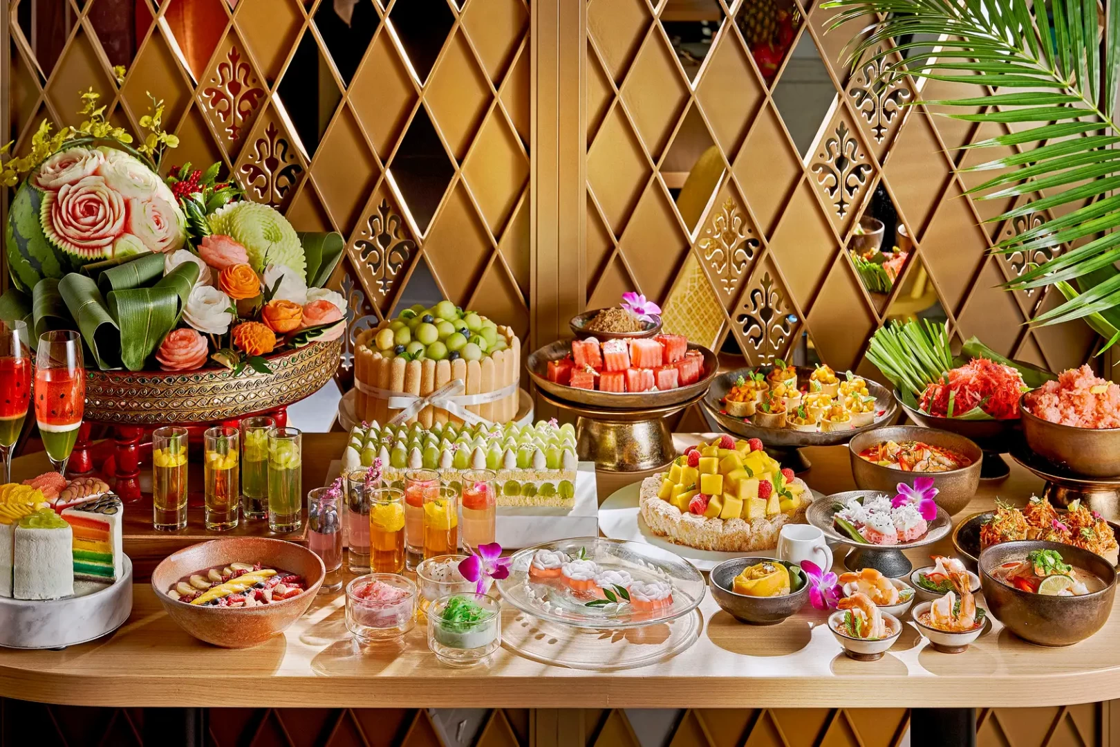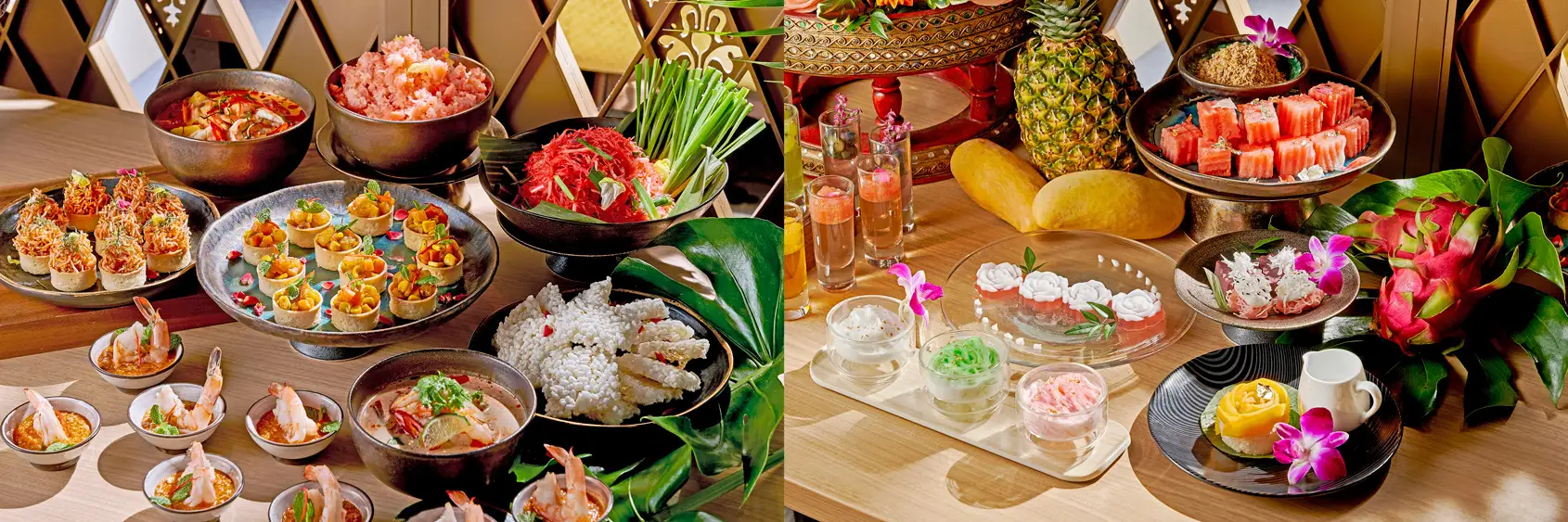 今回のデザートビュッフェでは、夏に旬を迎えるマンゴーやマスカットなどのサマーフルーツをふんだんに使用したケーキやタルト、ゼリーなどのスイーツと、伝統的なタイ料理をフルーツでアレンジしたセイヴォリー、そして自由にカスタマイズできる人気のアサイーボウルなど、45種類以上ものメニューが楽しめます。