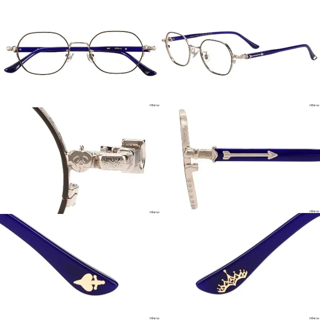 毒リンゴのメタルパーツがひと際目を引くフロントサイド。リムには王冠の彫金が。ネイビーとゴールドのカラーリングが印象的なテンプルには、矢をモチーフとしたメタルパーツをデザイン。テンプルエンドの左右には茨の冠とハートに剣の箔押しをプラス。