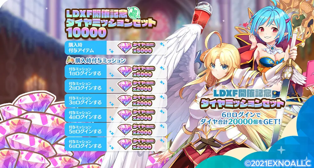 ダイヤミッションセットでは合計「無償ダイヤ15000個」が、スタミナ&経験値ミッションセットでは合計で「無償ダイヤ300個」、「3000スタミナ」、「1800経験値」を入手できます!