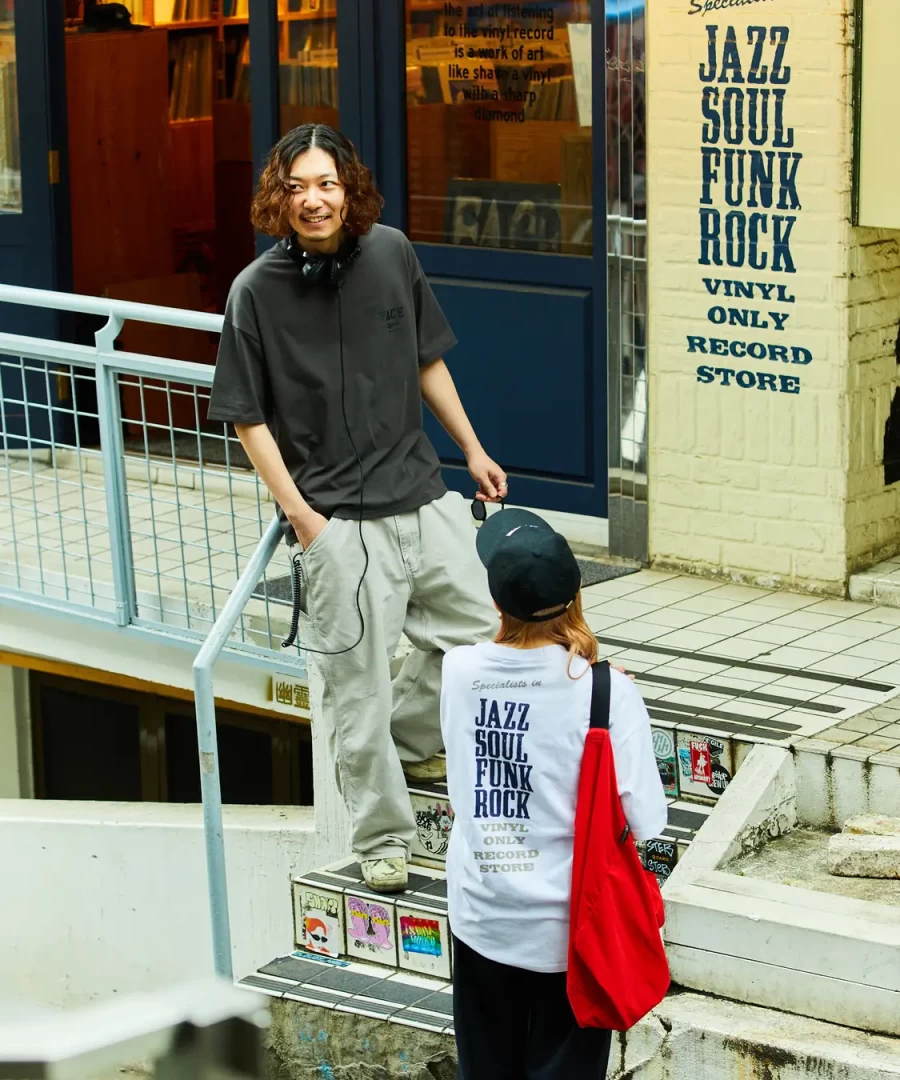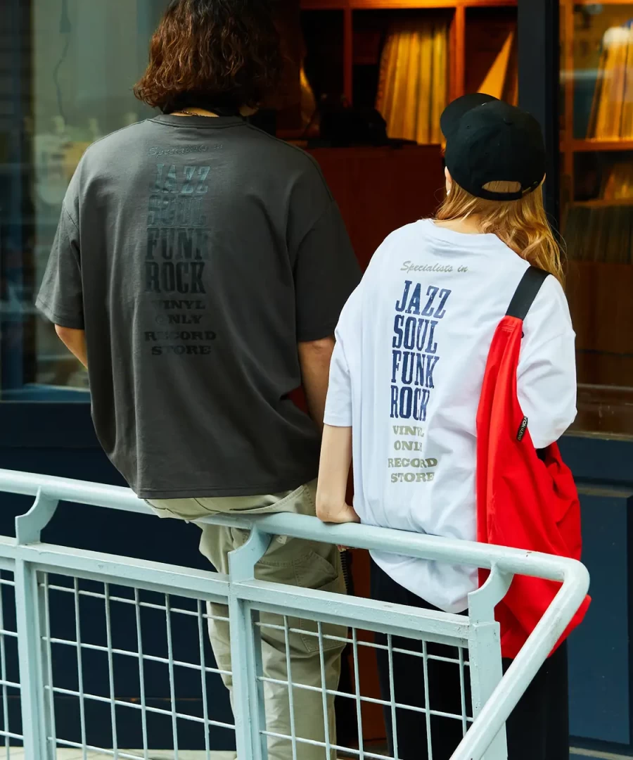 昨年秋に発売した、Face Records × FREAK’S STORE『ビッグシルエット バックプリント クルーネックスウェット』※ で好評をいただいた、「JAZZ SOUL FUNK ROCK」のグラフィックをバックプリントしたデザインを半袖Tシャツで販売します。このグラフィックはフェイスレコード渋谷店の入り口壁面に実際に描かれているもので、店舗を象徴するビジュアルのひとつです。今回は春夏シーズンをさわやかに彩るホワイトを追加し、4色で展開します。
