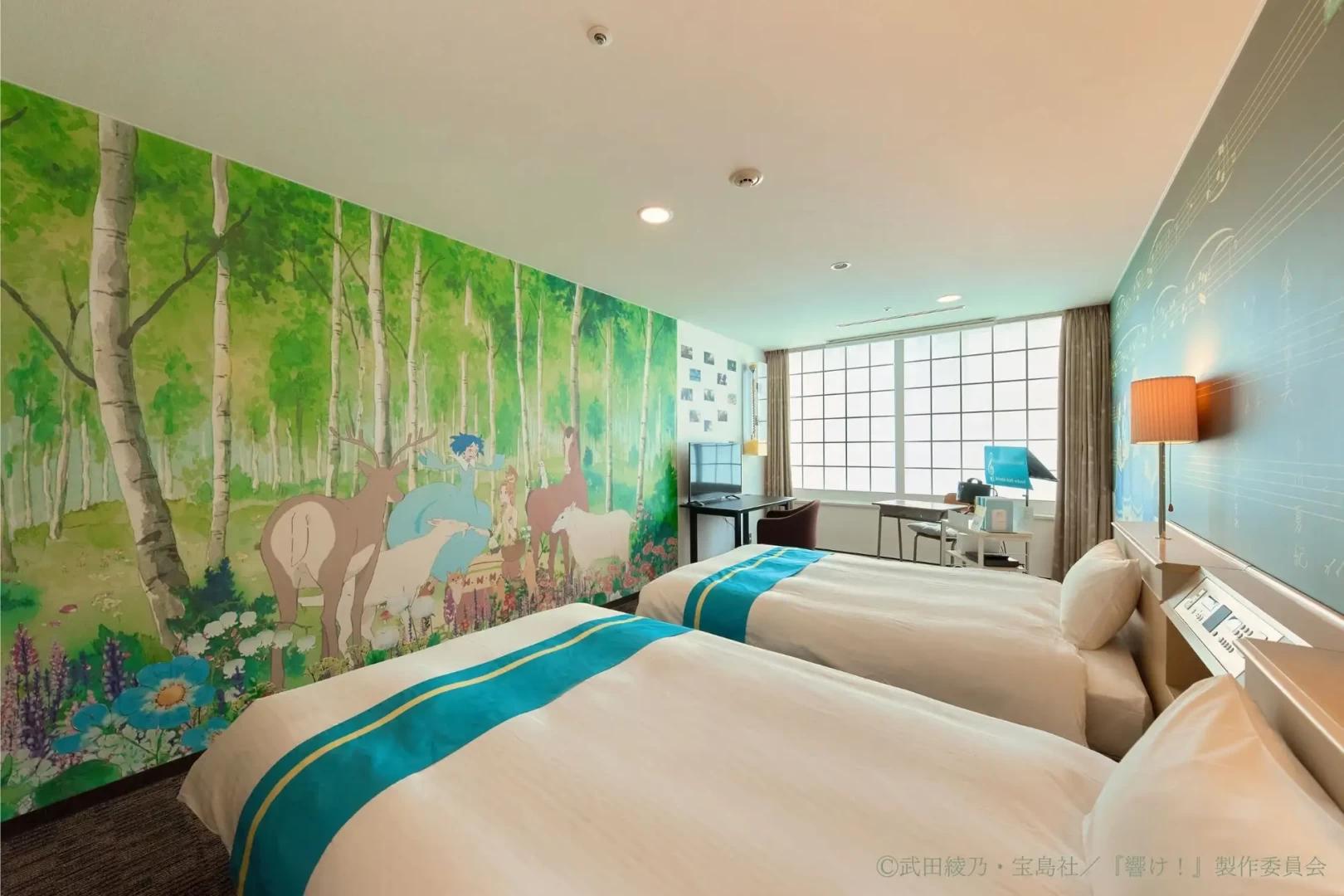 京都タワーホテルでは、アニメ『響け!ユーフォニアム』シリーズ(『響け!』製作委員会)とのコラボ企画として、下記のコラボルームを販売中です。物語の世界に入り込んだかのようなお部屋で、作品との日々を振り返りながら、素敵なひと時をお過ごしいただけます。