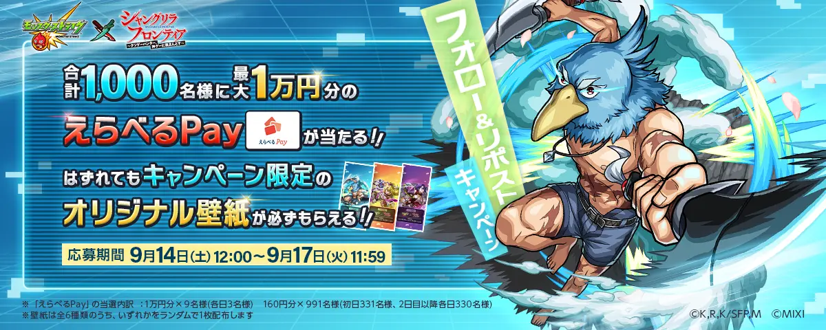 モンストキャンペーン公式 Xアカウント (https://x.com/monst_campaign) から投稿される対象ポストを期間内にリポストすると、さまざまなスマホ決済サービスのポイントを自由に選べる「えらべる Pay」最大1万円分が抽選で 1,000 名様に当たる。抽選にはずれても、本キャンペーン描き起こしのスマホ壁紙(全 6 種)から、1 種が必ずもらえるとのこと。